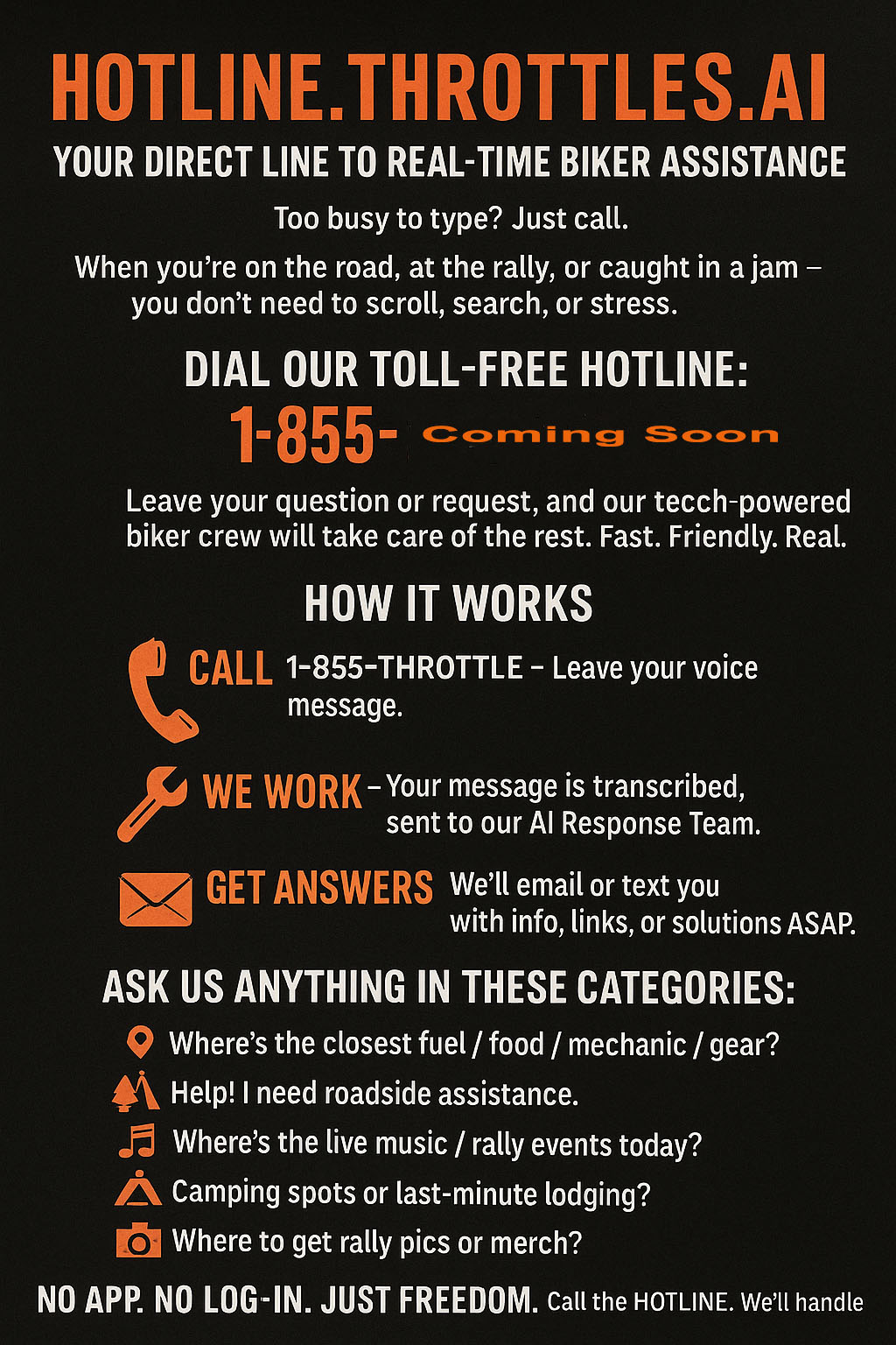 Call us with your question to 1-855-coming soon. Just be clear and straight-up — no fancy formatting needed. Example: "What’s the best 5-day loop ride through Arizona with fuel stops?"